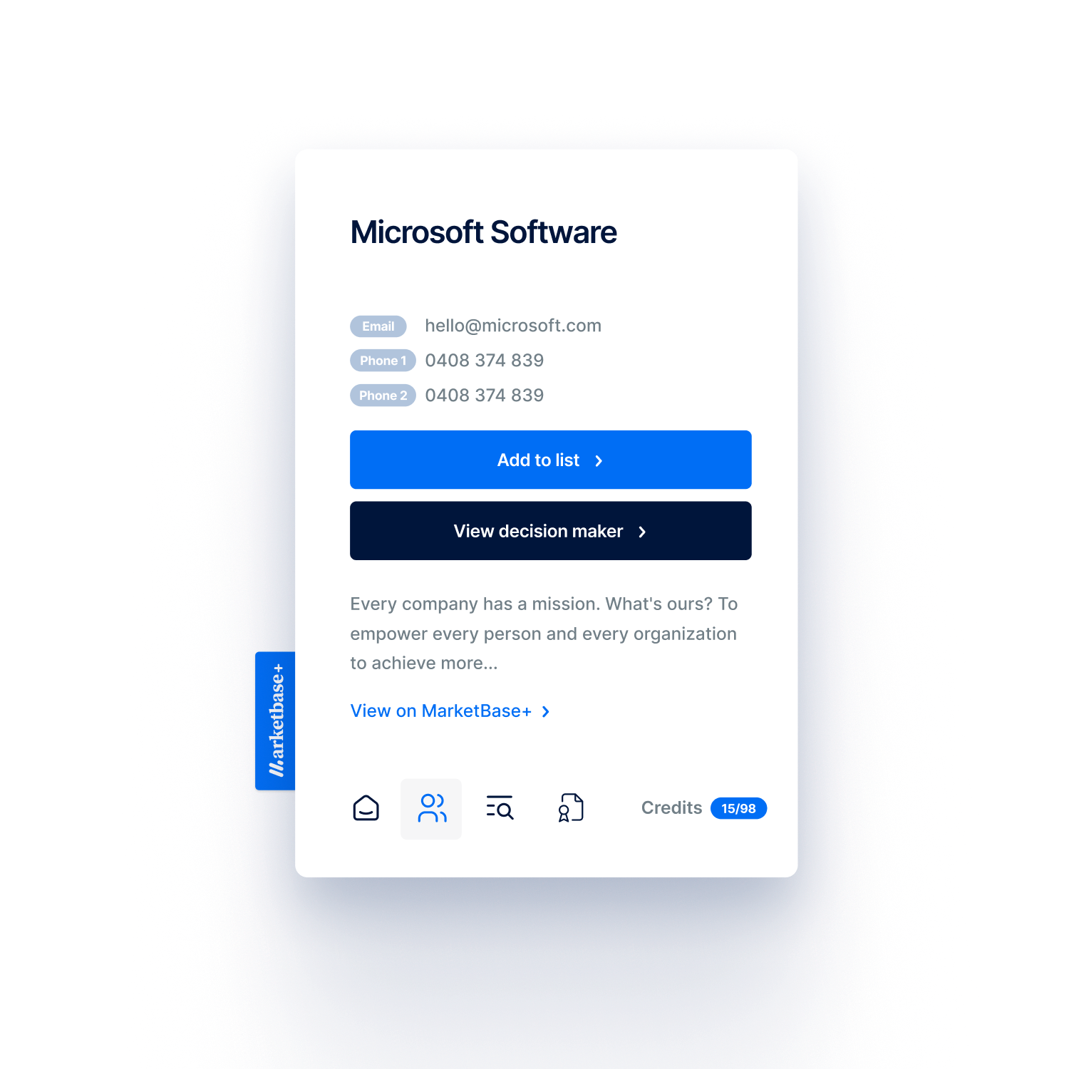 MarketBase+ for CRM reduces the burden of manually adding account, contact and lead data to your CRM. Automatically and seamless populate key information including address, email, and mobile numbers seamlessly into your CRM with just a couple of clicks.