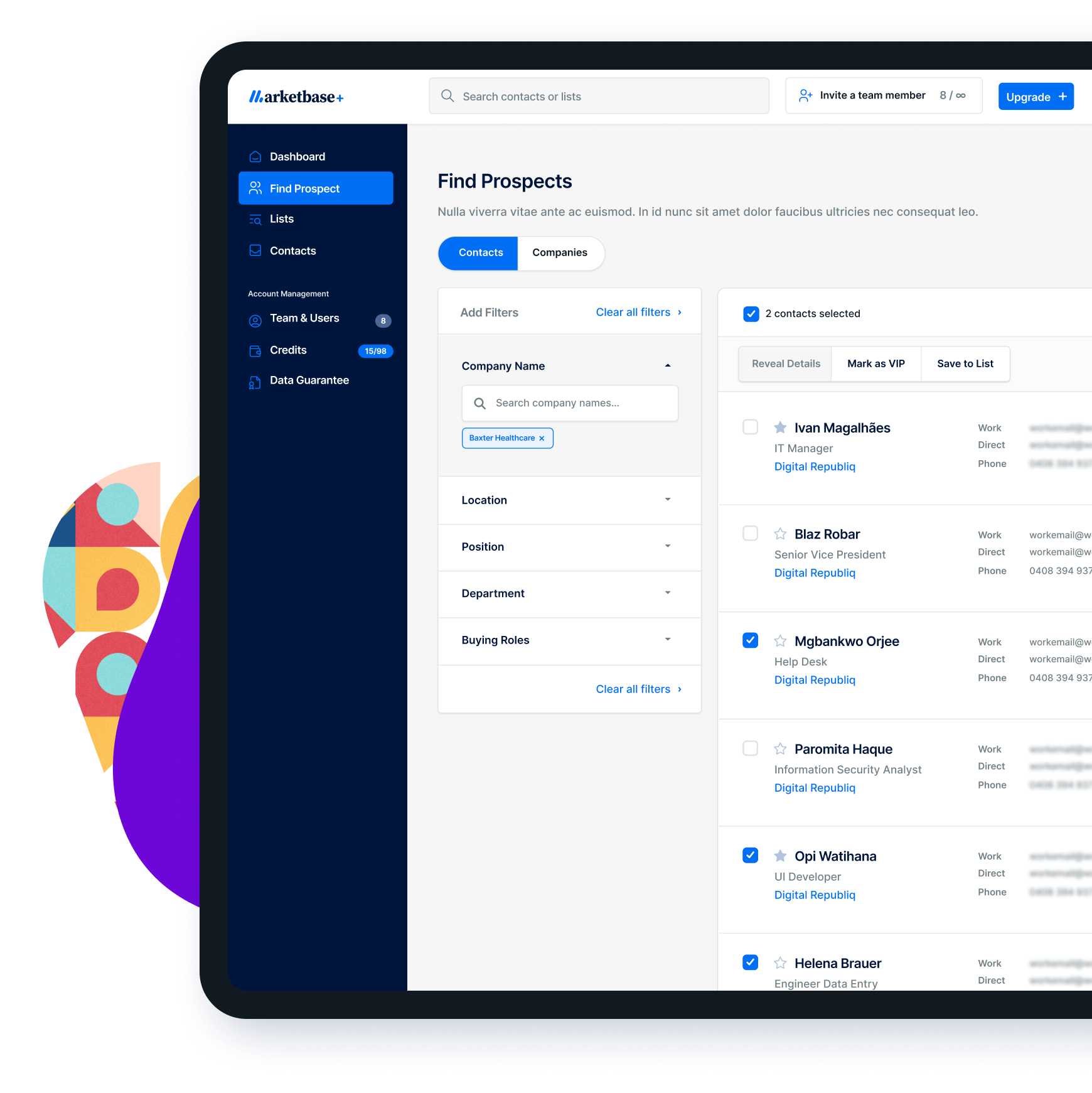 Our data spans not just corporate emails and direct contact numbers, although those are often the juiciest titbits for our partners. We also have many other data points that are sure to satisfy. Data like the size of businesses, locations, information about organisations’ c-suites and decision making units, or technology available to the company can help you find the perfect match for your ideal customer profile and navigate a complex buying cycle. MarketBase+ makes all these details available to you, so you can put your best foot forward and close your next sale.